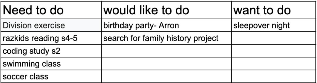 新的一周开始前,找出专属时间与孩子讨论下周待办事项,可以必需要完成、想完成(可以再等一会)、想要做的事(娱乐休闲活动等)来安排一周。