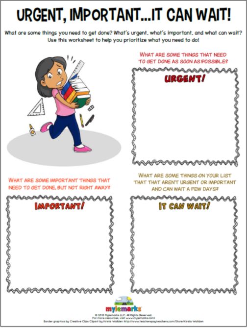 在日程安排上有冲突是很常见的,比如孩子更想玩电脑游戏而不是锻炼身体。此时,家长应该与孩子讨论如何根据他的价值观和需求,确定活动的优先级。下面这张表格将事情分成紧急、重要、可以等待三类,可以打印出来和孩子一起协商制定。
