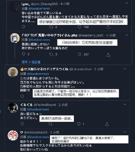 疫情初期,来自日本政府和民间支援的力量曾感动了不少两国民众,如今中国也开始向日本支援医疗物资:之前一个小城羽咋市和南通市通州区是友好城市,艰难筹集口罩赠来四千个,近日南通市回赠了一万个口罩,附赠诗句“青山一道同云雨,明月何曾是两乡”;阿里巴巴公益基金会和马云公益基金会筹集了100万个口罩,捐赠给急需这些的日本医院,物资上写着“青山一道,同担风雨”......日本网友留言感谢这种守望相助的友谊。