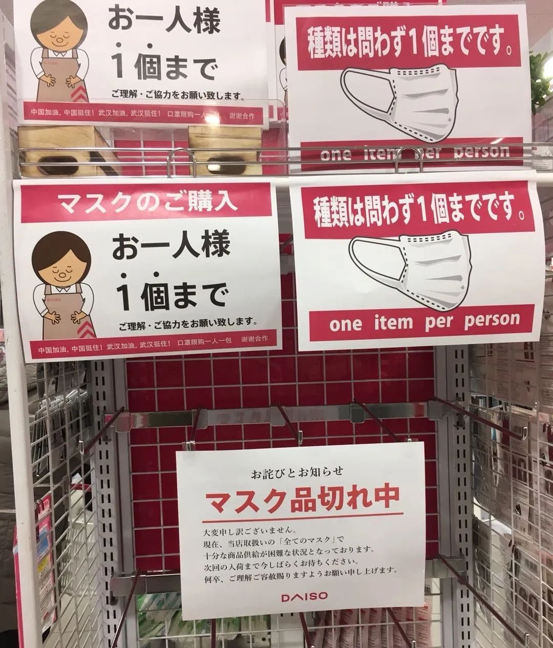 无论是超市或药局,口罩的货架永远都是空的。从春节过后,百元店大创的口罩货架一直空着,上面贴着“对不起,口罩已经买完”的告示,上面还有一排小字“中国加油!武汉加油!”,显得无可奈何,却又温情脉脉。