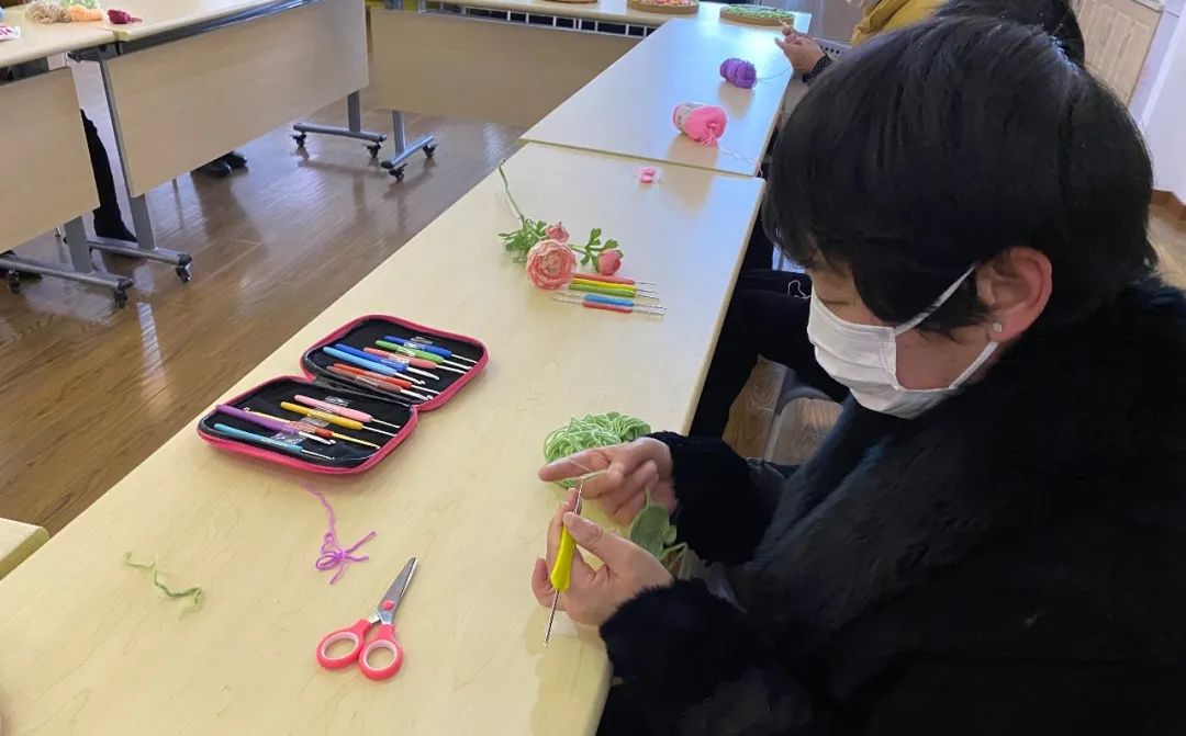 3月4日,在青村镇青村镇社区文化活动中心的活动室,上海市非物质文化遗产项目钩针编织技艺第一代传承人何菊芳,正带着几位老姐妹安静地钩针编织毛线口罩。