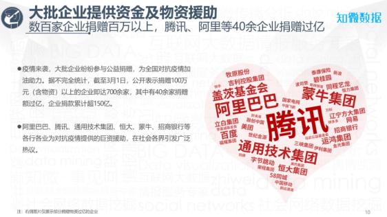 疫情爆发初期,不少知名企业发挥行业示范作用,带头参与捐赠。如互联网企业方面,腾讯基金会捐3亿元设抗疫防控基金、京东捐赠百万只口罩、斗鱼捐赠1000万元;房地产企业方面,恒大捐款2亿元人民币,碧桂园捐1亿元设抗疫基金……