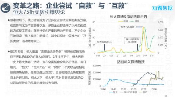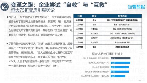 “恒大”“恒大75折”和“房价”3个关联话题相继登微博热搜榜,最高热度达222万;全日微博综合热度较前日上升近12倍,热度甚至远高于恒大1月24日豪捐2亿元这一公益活动。