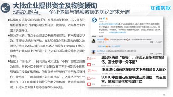 @SOHO中国 于1月24日发布了两则分别给中建三局和武汉凌云的致谢信,但其微博热评就有不少网友质疑其称“蹭热度”“嘘寒问暖不如打笔巨款”,各网络平台也一直有关于SOHO中国未捐款的负面文章传播。香港首富李嘉诚、台湾大企业富士康等也存在相似问题。