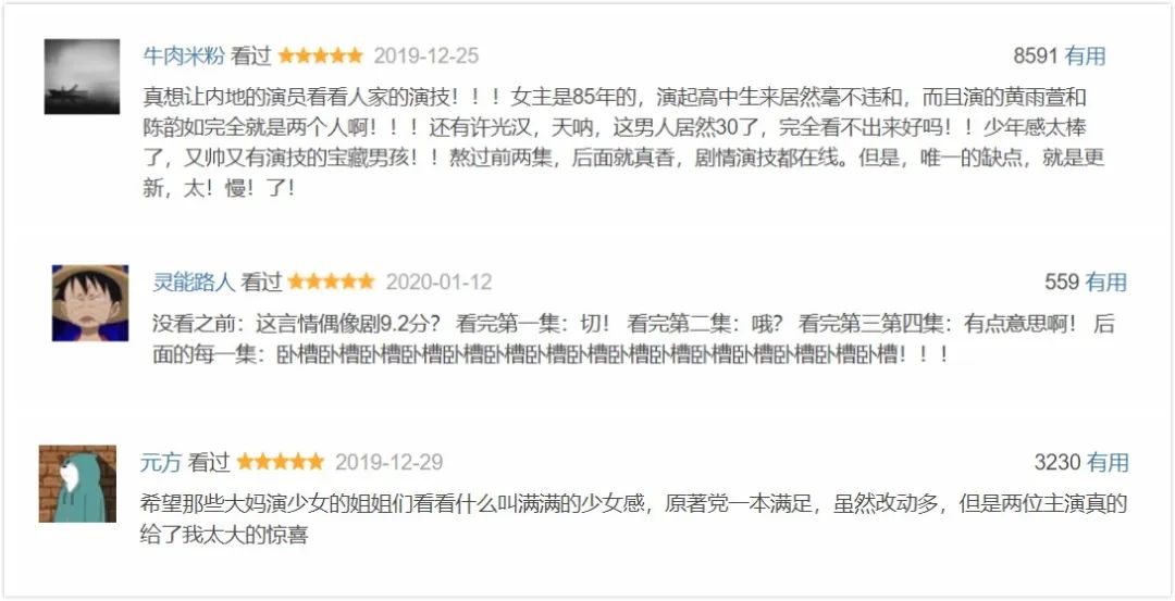 在这两部凭实力逆袭的黑马之作中,热门评论里集中了对剧情和演员演技的盛赞。剧本好不好,演员演技能不能打,正在成为越来越重要的真香标准。