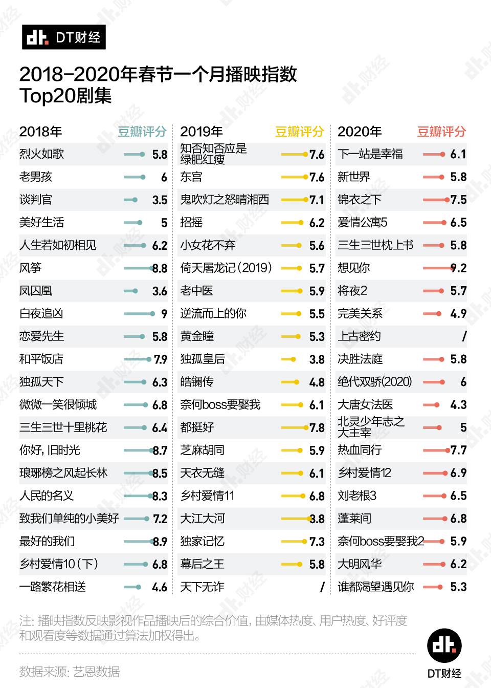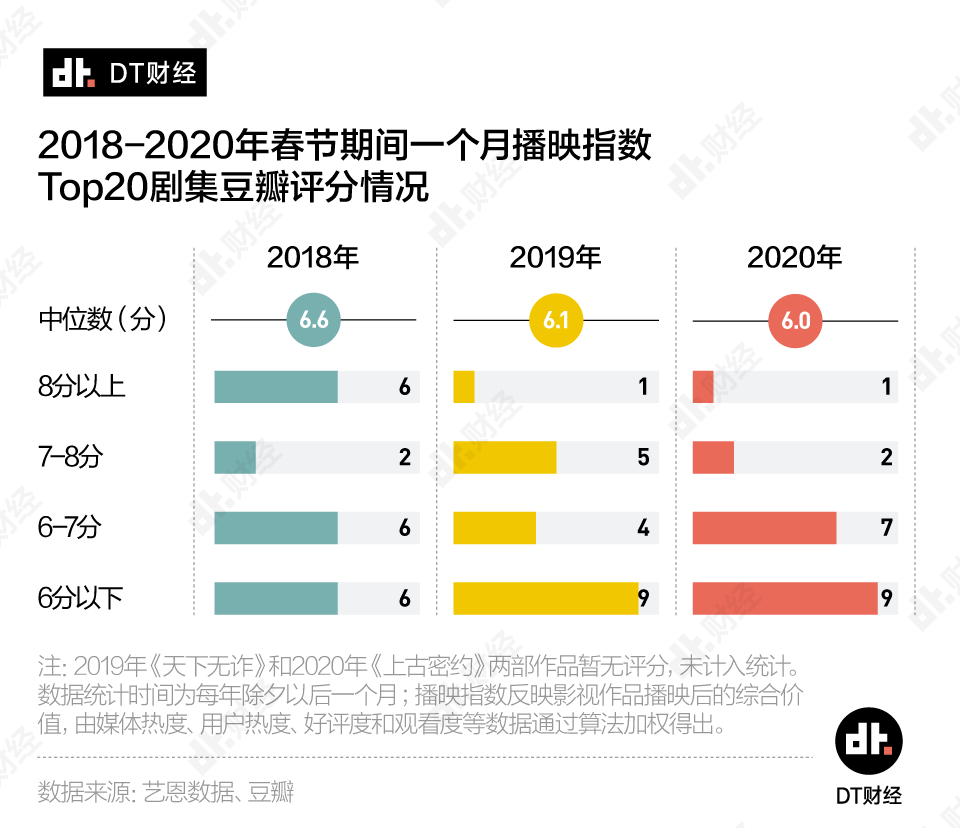 我们统计比较了2018-2020年春节后这个月的头部剧集作品豆瓣评分,发现开年大剧的质量确实逐年下滑。
