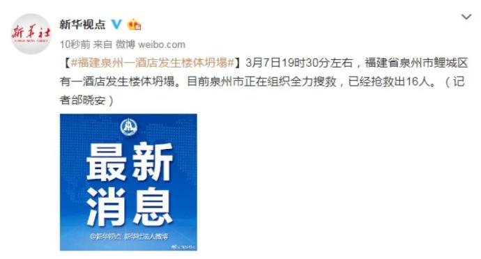 3月7日19时30分左右,福建省泉州市鲤城区有一酒店发生楼体坍塌。目前泉州市正在组织全力搜救,已经抢救出16人。