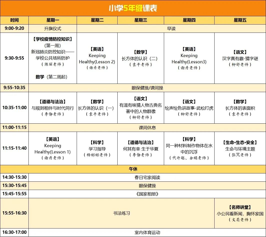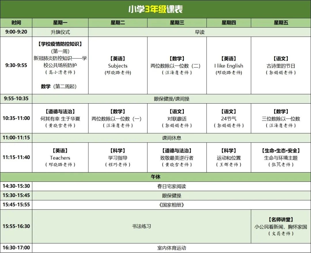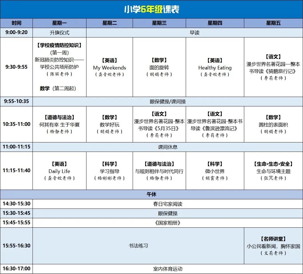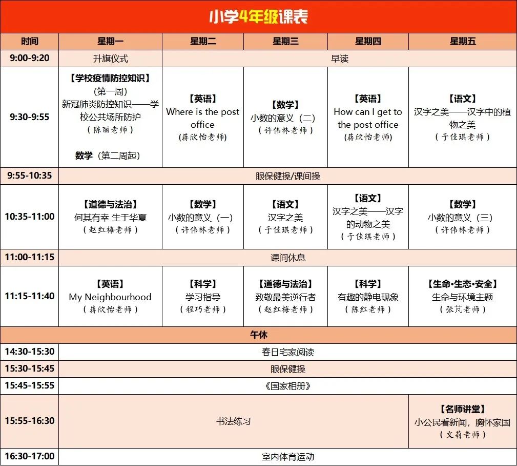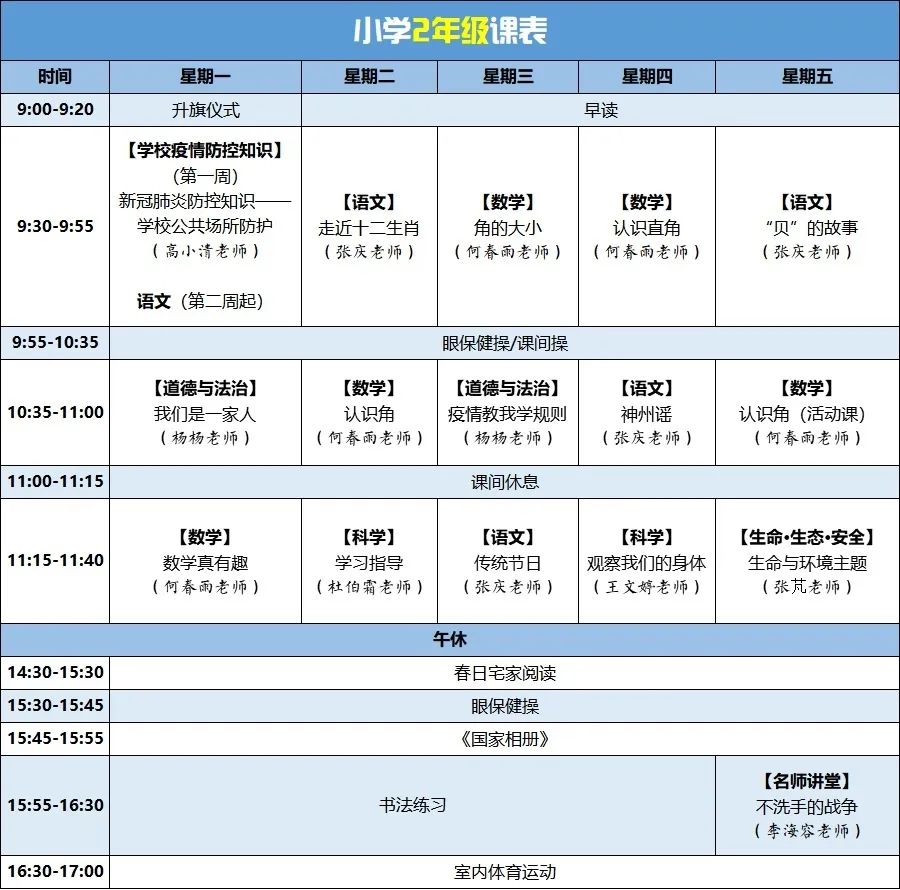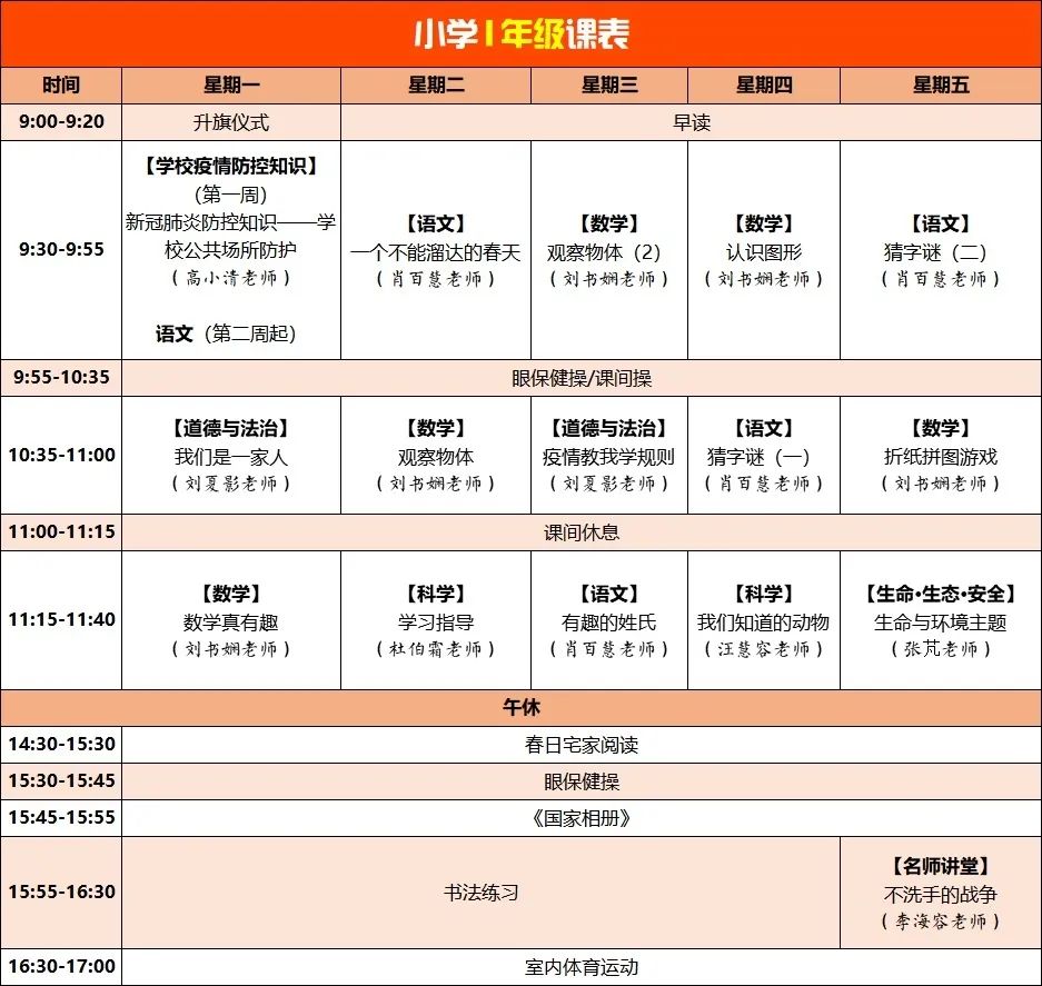 1.小学课表供我省疫情防控延期开学期间小学1-6年级使用。学校疫情防控知识、学科教学、国家相册、名师讲堂等相关课程资源从3月9日开始通过有线电视、IPTV、网络平台进行推送。