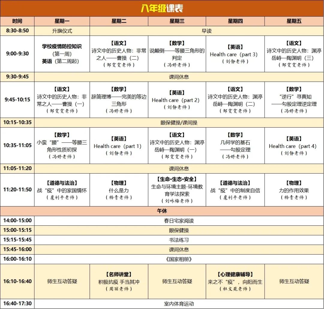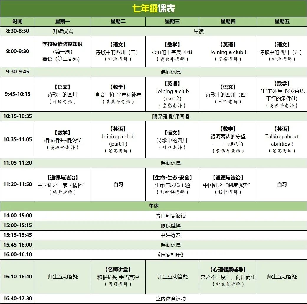 1.以上课表供我省疫情防控延期开学期间七年级、八年级使用。学校疫情防控知识、学科教学、国家相册、心理健康、名师讲堂等相关课程资源从3月9日开始通过有线电视、IPTV、网络平台进行推送。