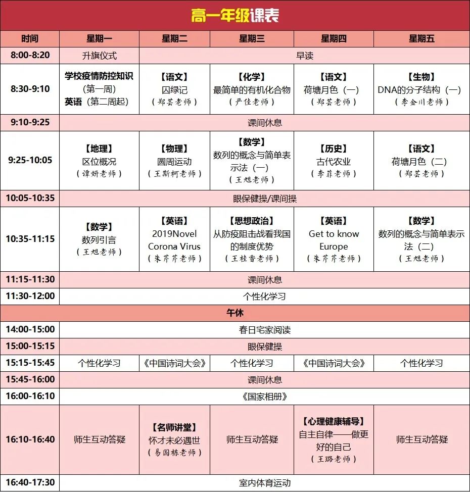 1.以上课表供我省疫情防控延期开学期间高一年级、高二年级使用。学校疫情防控知识、学科教学、国家相册、心理健康辅导、名师讲堂等相关课程资源从3月9日开始通过有线电视、IPTV、网络平台进行推送。中国诗词大会可登录央视网站观看或访问省教育资源公共服务平台专区链接。