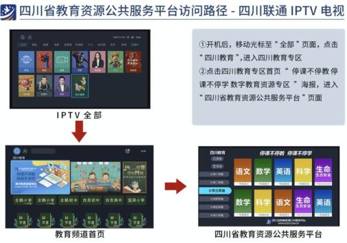 我省线上教学课程可通过省广电有线电视提供的专用直播频道实时收看、时移回看,也可以通过四川电信、四川移动、四川广电、四川联通网络电视(IPTV)相应专区和省资源平台专区同步点播和根据需要随时回看。