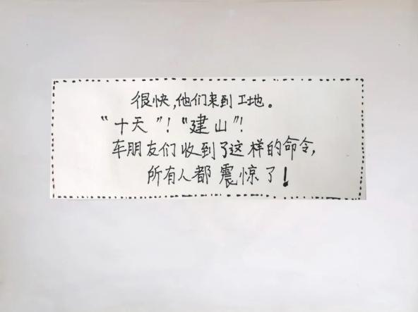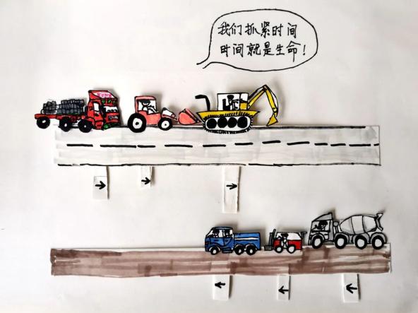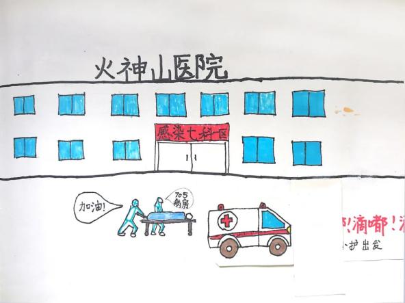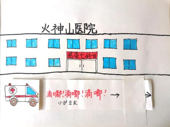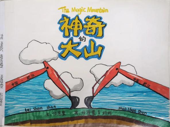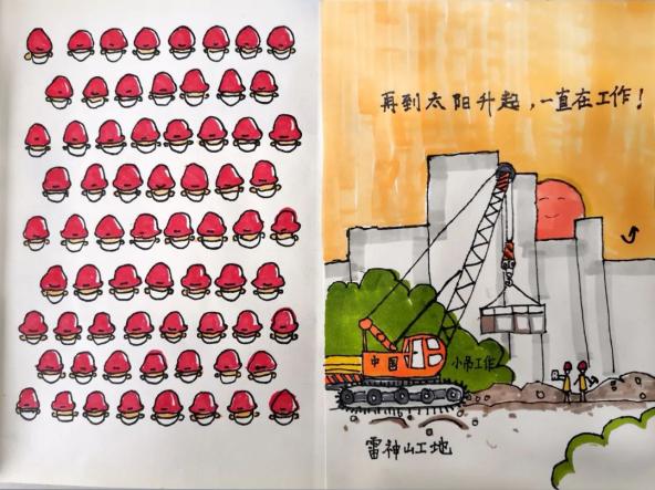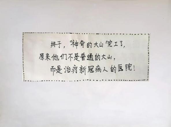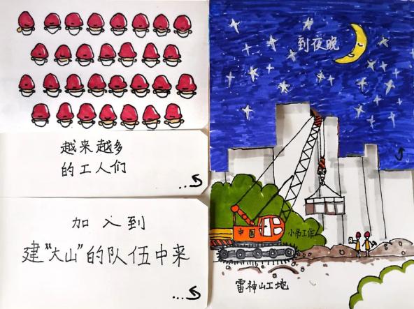 这次疫情期间,任思蒙小朋友每天都有关注疫情新闻,新闻里很多挖掘机同时开工的场面震撼到了他。他最感兴趣的就是雷神山和火神山医院的建造,成了之前“云监工“大军中的一份子。在妈妈的帮助下,他花了一周时间,创作了《神奇的大山》。
