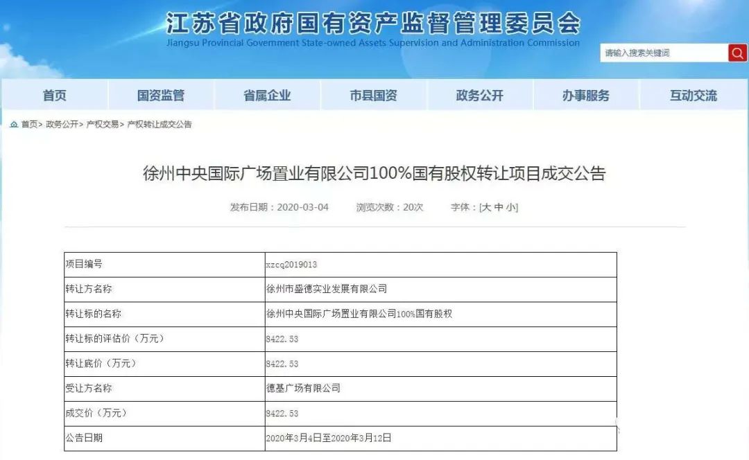 记者注意到,这个编号:xzcq2019013的转让项目,转让方正是徐州市盛德实业发展有限公司,转让标的名称是徐州中央国际广场置业有限公司100%国有股权,转让标的评估价(万元)、转让底价(万元)均是8422.53。受让方为德基广场有限公司。
