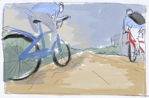 (标哥:你好!说实话,你们班上的人名和具体哪一个我还对不上,但通过这次疫情下的教学,人名和作品可被我记住了,你应该是班里一等一的高手吧?大学教学就是这样,越是高手老师越挑剔,越是低手老师总是想法子鼓励。现在开始对你提要求了,1、创作中要有意吸收大师作品的语汇,比如霍克尼等,你自己喜欢哪一个大师都可以参照,甚至直接套到画面来做变体。2、这套绘本创作,场景、人物比较单一,你要有意把人物节奏和风景穿插起来,几页是人物为主,再来一页风景,怎么安排是你的事情,别让我只看到两个小伙在骑单车。3、每一幅画要有形式感,要有独幅画的感觉,不管是树、山、电线杆、房子等,每张画面里主体的比例,要以一种为主,它与人物的关系,产生形式构成,要求是太高了,但我相信你的水平,可以做到没有问题的。另外想告诉你,最后一页够难看的,不是画的不好,是构图有问题。还是为班里有你这样的高手而高兴!我又要去烧晚饭喝杯酒了。王犁2020年2月25日黄昏)