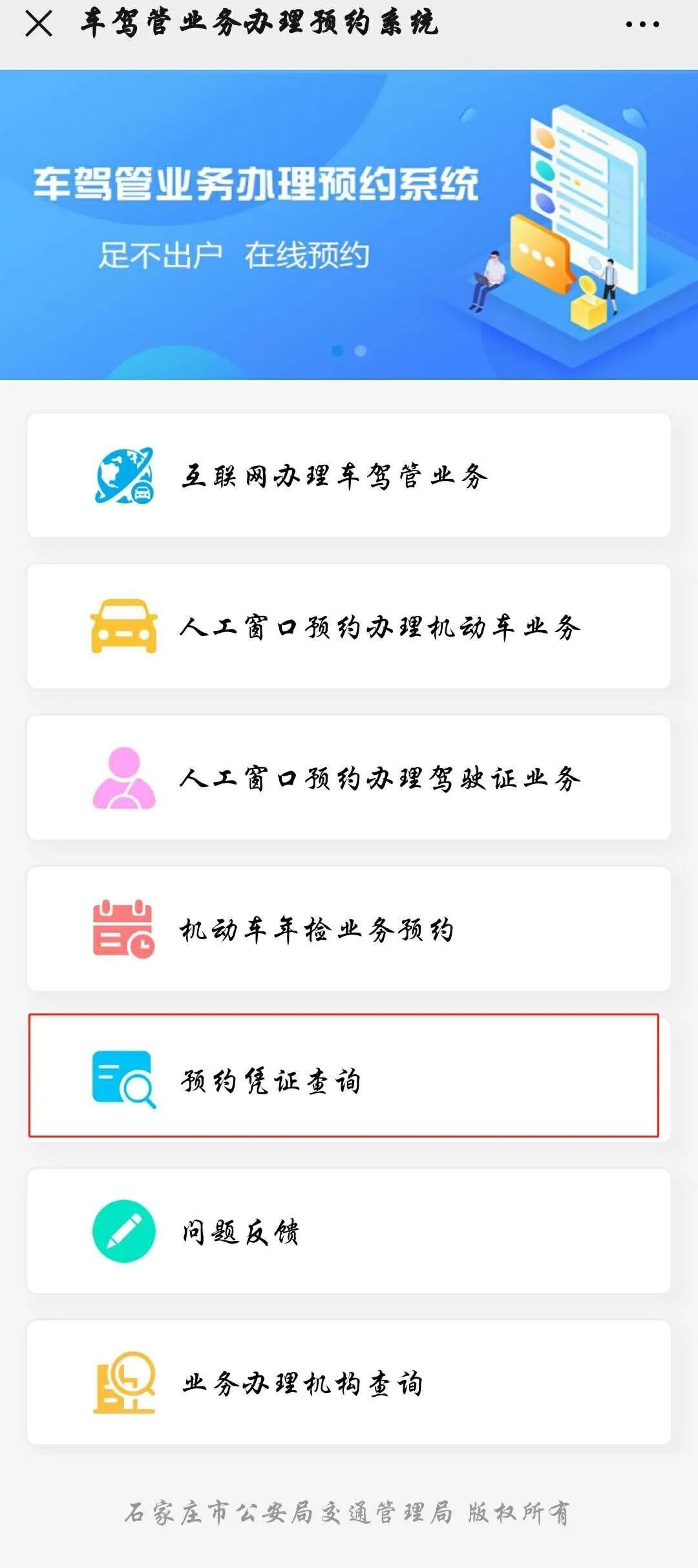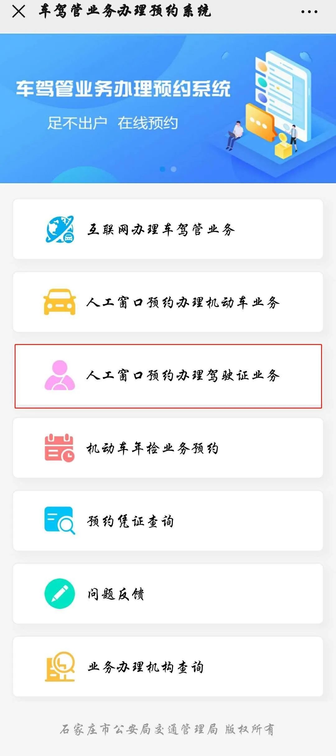 1、微信预约:通过“石家庄公安交警”、“石家庄车驾管在线”微信公众号车驾管业务预约程序办理。(该程序将于随后上线)