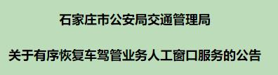 为服务保障企业复工复产,方便群众办理车驾管业务,自2020 年3月10日起,石家庄市交管局将有序恢复车驾管系统人工窗口业务办理。