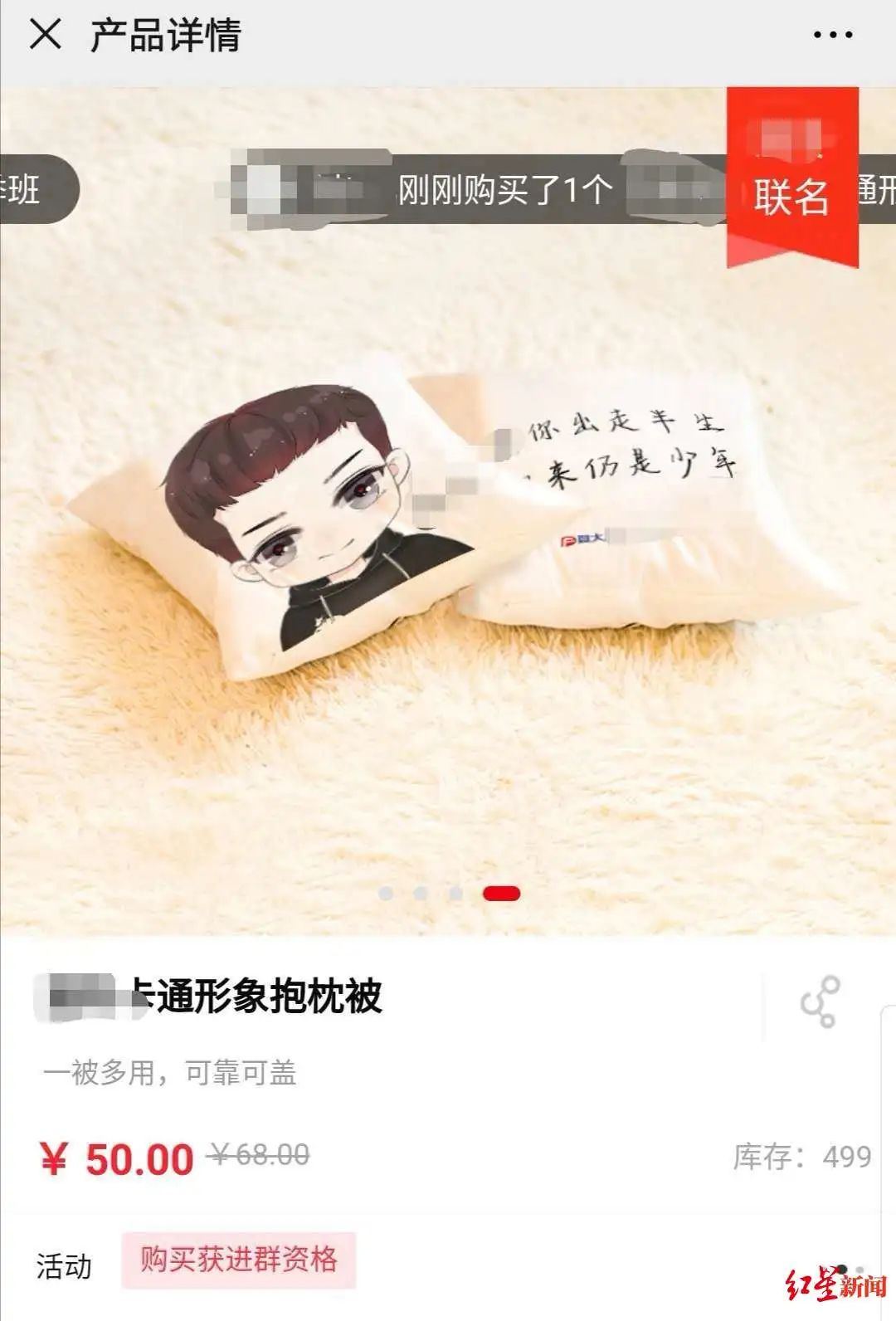 红星新闻记者进一步查看商品简介注意到,“温X卡通形象抱枕被”上印有温姓教师的卡通形象及个人签名,在枕身背后写有“愿你出走半生,归来仍是少年”字样。
