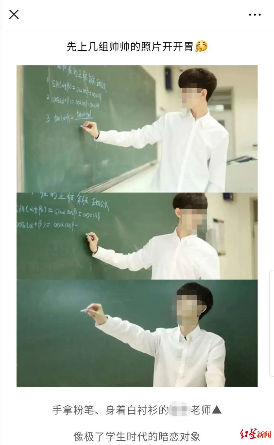文章顶端,温姓教师身着白衬衫,手提领口,歪头将其放在嘴唇上的照片十分瞩目,文章开篇写道:有一种季节,叫温X(温姓教师名字)。