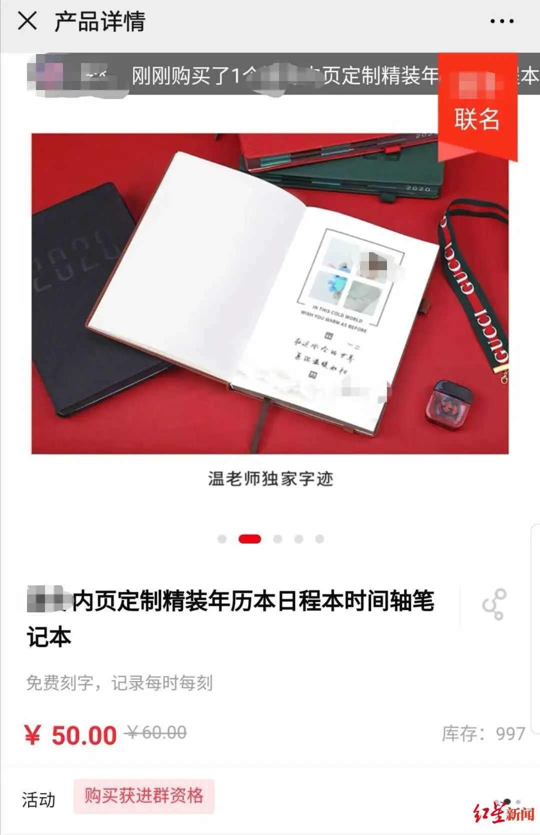 在“温X内页定制精装年历本日程本时间轴笔记本”的详情介绍中,该笔记本有简奢黑和魅惑红两种颜色,主打“温老师独家字迹”特色,甚至拥有“温老师专属内页”。