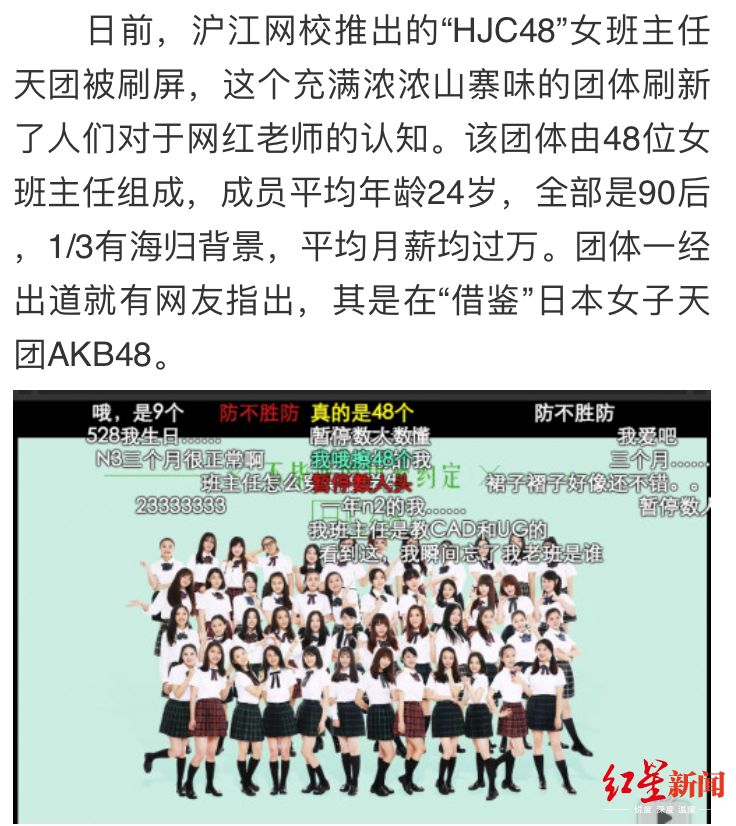 其中,沪江网校曾在2016年七周年之际,推出名为“HJC48”、号称天团的班主任团体组合,并号称国内首个。这批自称拥趸超过20万“粉丝”的女班主任们还推出了“不毕业的甜蜜约定”海报写真,并首发舞蹈MV《更好的自己》。平台在宣传中还称,这些班主任们服务过的学员,自发组成粉丝团,还有学员主动要当粉丝团。不过,沪江的这个班主任团体虽然从画风像极了日本女团AKB48,但还是被批“画风山寨”,并引发争议。