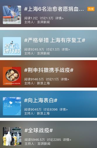 配合疫情防控和复工复产等关键时间节点,市委网信办策划推出正能量话题,#严格举措 上海有序复工##上海小囡上网课啦##上海医疗队加油##平凡之光申心动人##寒潮战疫共同守沪##我是上海抗疫志愿者##心理战疫##上海辰山云赏花#等各类话题,既包含上海战疫实绩,又涵盖了疫情期间政策解读、知识科普、心理疏导等方方面面,有力支撑本市疫情防控、有序复工等各项举措。