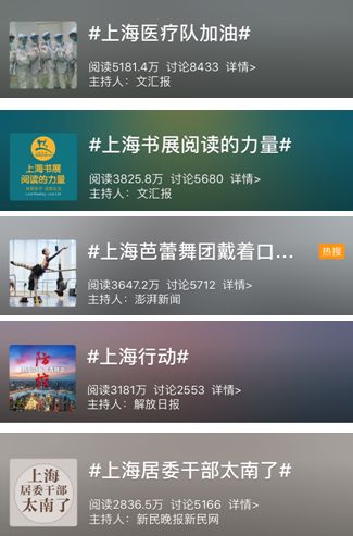 在市委网信办的支持与协调下,团市委“青春上海”主持开设微博话题#我是上海抗疫志愿者#,市卫健委“健康上海12320”开设微博话题#科学防疫一起来#,市教委“上海教育”开设微博话题#上海小囡上网课啦#,相关话题均取得良好效果,其中#我是上海抗疫志愿者#话题阅读量已过亿。