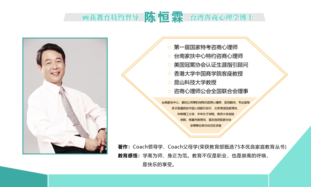 陈恒霖:台湾咨商心理学博士,画荻教育特约督导,第一届国家特考咨商心理师,台湾咨商心理学博士,美国冠冕协会认证生涯指引顾问,香港大学中国商学院客座教授,昆山科技大学教授,咨商心理师公会全国联合会理事,台南家扶中心、顾问公司等机构特约咨商心理师、咨询顾问、专业督导。多次受邀前往中国人民银行总行、北京海淀区教育局、华南理工大学、中华女子学院、南京大学金陵学院、南昌市教育局、重庆自闭症家长协会等单位举办培训。