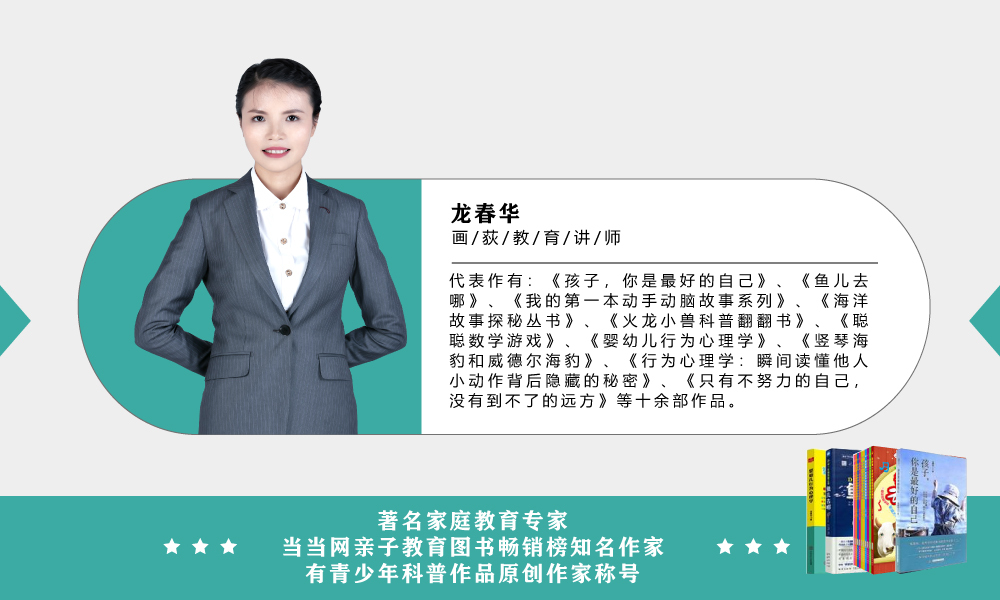 龙春华:龙春华,画荻教育讲师,著名家庭教育专家,亲子教育图书畅销榜知名作家,有青少年科普作品原创作家称号。代表作有《孩子,你是最好的自己》、《鱼儿去哪》、《我的第一本动手动脑故事系列》、《海洋故事探秘丛书》、《火龙小兽科普翻翻书》、《聪聪数学游戏》、《婴幼儿行为心理学》、《竖琴海豹和威德尔海豹》、《行为心理学:瞬间读懂他人小动作背后隐藏的秘密》、《只有不努力的自己,没有到不了的远方》等十余部作品。