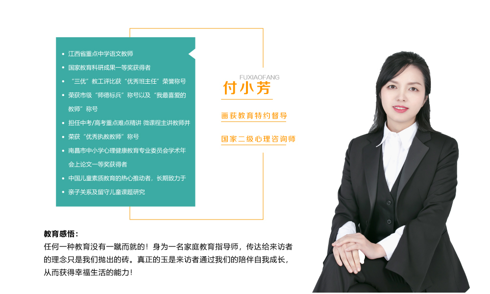 付小芳:江西省重点中学语文教师,画荻教育特约督导,国家二级心理咨询师,国家教育科研成果一等奖获得者,江西省重点中学语文教师,“三优”教工评比中荣获“优秀班主任”荣誉称号,荣获市级“师德标兵”称号以及“我最喜爱的教师”称号,担任中考/高考重点难点精讲 微课程主讲教师并荣获“优秀执教教师”称号,南昌市中小学心理健康教育专业委员会学术年会上论文一等奖获得者,中国儿童素质教育的热心推动者,长期致力于亲子关系及留守儿童课题研究。