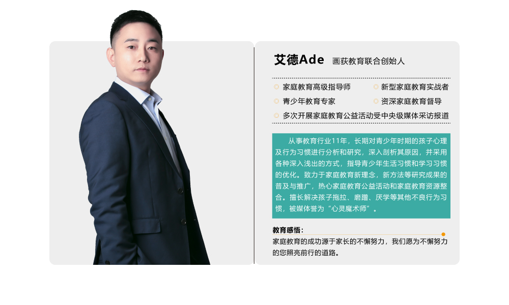 艾德:家庭教育高级指导师,画荻教育联合创始人,新型家庭教育实战者,青少年教育专家,资深家庭教育督导,家庭教育高级指导师,多次开展家庭教育公益活动受中央级媒体采访报道。从事教育行业11年,长期对青少年时期的孩子心理及行为习惯进行分析和研究,深入剖析其原因,并采用各种深入浅出的方式,指导青少年生活习惯和学习习惯的优化。致力于家庭教育新理念,新方法等研究成果的普及与推广,热心家庭教育公益活动和家庭教育资源整合。擅长解决孩子拖拉问。