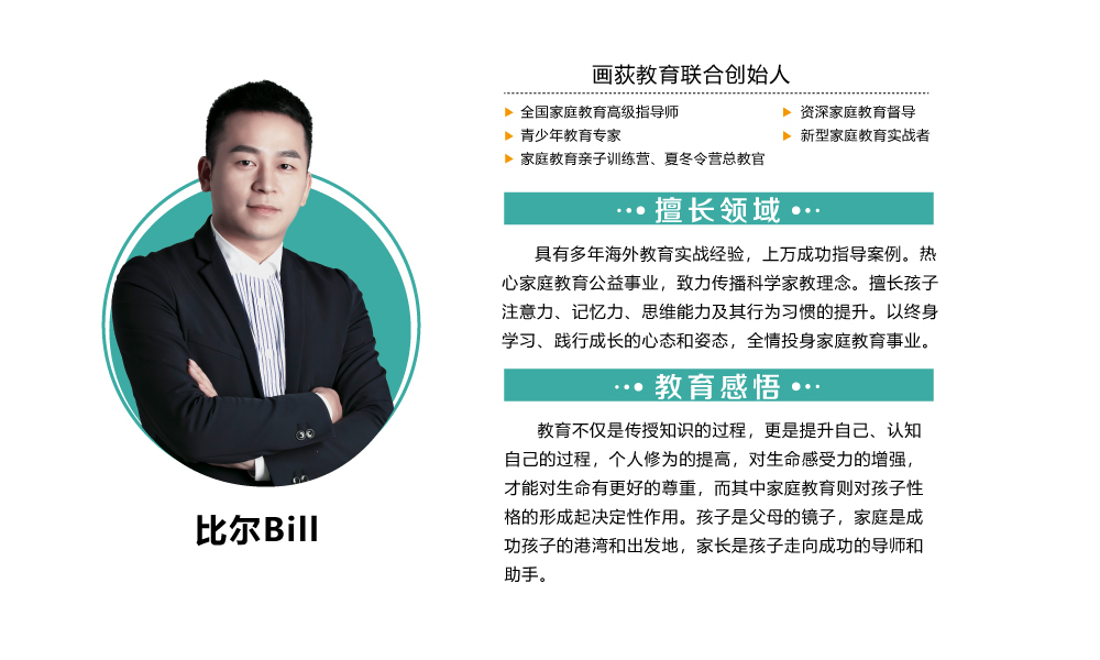 比尔:资深家庭教育督导,画荻教育联合创始人,全国家庭教育高级指导师,资深家庭教育督导,青少年教育专家,新型家庭教育实战者,家庭教育亲子训练营、夏冬令营总教官。具有多年海外教育实战经验,上万成功指导案例。热心家庭教育公益事业,致力传播科学家教理念。擅长孩子注意力、记忆力、思维能力及其行为习惯的提升。以终身学习、践行成长的心态和姿态,全情投身家庭教育事业。教育感悟:教育不仅是传授知识的过程,更是提升自己、认知自己的过程。