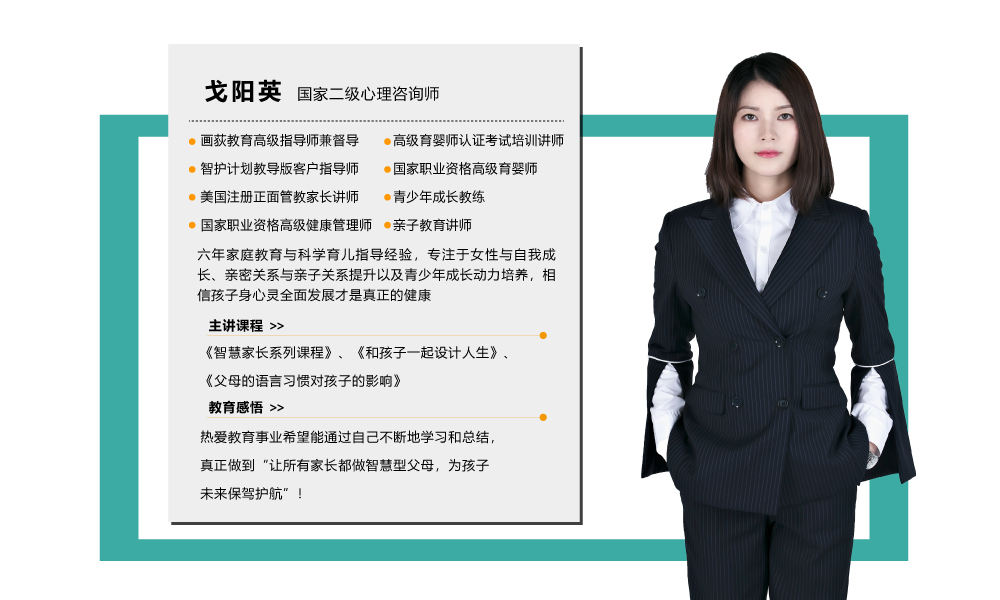 戈阳英:美国注册正面管教家长讲师,国家二级心理咨询师国家高级育婴师家庭教育高级指导师兼督导青少年成长教练美国注册正面管教家长讲师儿童生命品质教育导师高级育婴师考试培训讲师家庭教育实操经验六年,专注女性心灵与自我成长、亲密关系与亲子关系提升以及青少年成长动力培养主讲课程:《智慧家长系列课程》、《和孩子一起设计人生》、《父母的语言习惯对孩子的影响》。