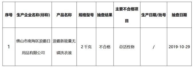 经检验,发现1批次产品不合格,不合格项目涉及总活性物含量项目。针对抽查中发现的产品质量问题,佛山市市场监督管理局已经依据相关法律法规的规定对不合格产品生产企业予以处理。