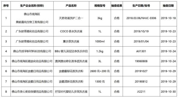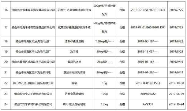 2019年佛山市市场监管局组织开展了洗涤用品(餐具洗涤剂、洗手液、洗衣液、洗衣粉、香皂)产品质量“双随机”专项监督抽查。