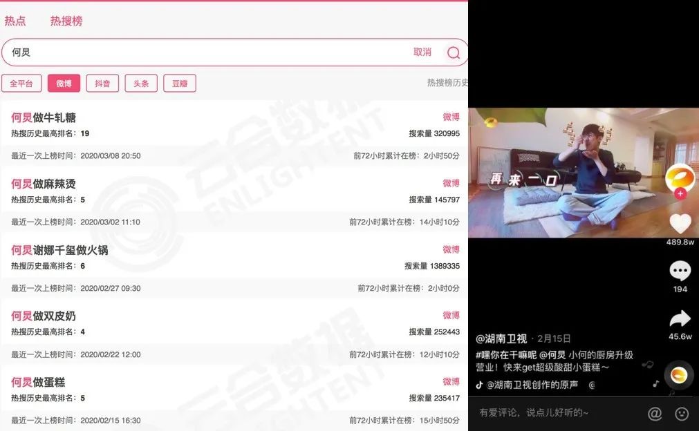 2月7日开播的湖南卫视“云综艺”《嘿!你在干嘛呢》中,何炅每期都会教观众做一道简单的料理,迄今已经做了五道菜、上了四轮热搜。其中2月14日晚播出的做蛋糕内容反响最好,做蛋糕视频的单条微博转发超过了5万,抖音上何炅做蛋糕视频点赞超过480万,是十足的爆款。