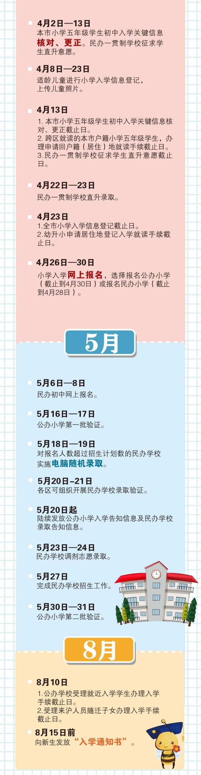 据悉,3月13日,各区将公布义务教育学校招生工作实施方案。3月20日,各区将公布公办小学招生划片范围、公办初中入学方式等具体信息,民办学校将陆续公布招生简章,相关公办学校也将公布包括入学排序细则在内的招生入学通告(方案)。本市今年将继续做好本市户籍“人户分离”适龄儿童居住地登记入学工作,3月20日由各区公布相关实施细则。3月底-4月初,各区将组织幼儿园大班家长会和小学毕业班学生家长会,解读义务教育招生政策。