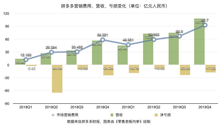 今日,拼多多发布了2019年第四季度及2019年全年财报。这次的财报整体来说是延续了上一季度的趋势,各项运营数据均有所上涨,但营销费用也同步大幅攀升。不同于上一季度的是,这一季度拼多多整体的亏损有所收窄。