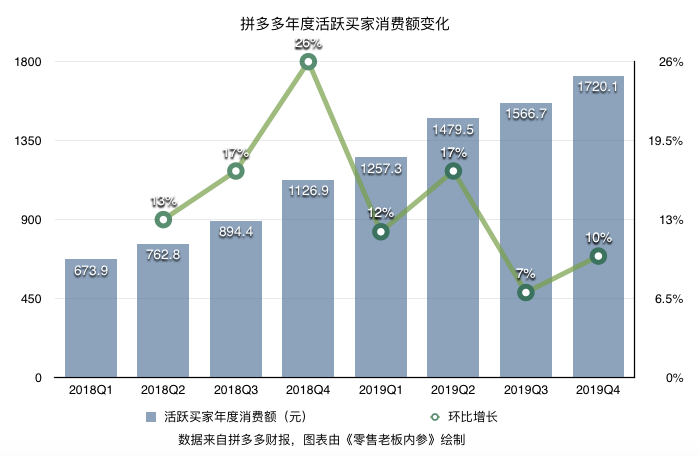 从财报上来看,可能是要打个问号的。Q4财季,拼多多的活跃买家的年平均消费额为1566.7元,环比增速为9.8%。而本季度用户数环比增长比例为9.2%,二者的增速是几乎是持平的。