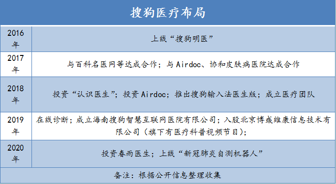 医疗一直是搜狗AI战略落地的重中之重。多年来,为了布局AI医疗,与搜索进一步实现融合,搜狗先后发布了“搜狗明医”、在线诊断等医疗搜索产品,还在拿到互联网医院牌照后设立了海南搜狗智慧互联网医院有限公司,并投资了“医学微视”、“认识医生”等医疗项目。甚至早在2018年4月,王小川便透露要成立医疗相关业务团队,和搜索、输入法团队平级。