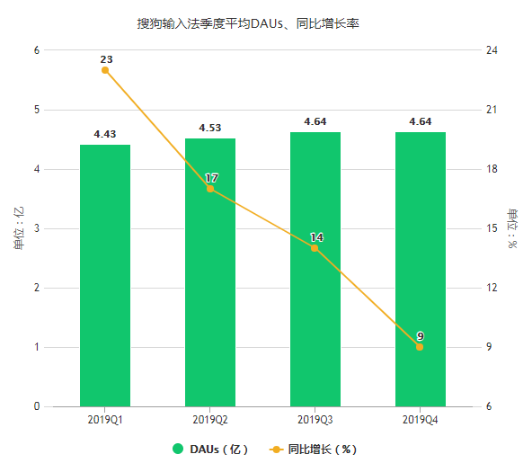 但从2019年全年及Q4情况来看,搜狗输入法用户增长疲乏,AI助手没能有效吸引新用户。据财报,Q4输入法平均日活为4.64亿,与Q3持平,而且日均语音请求次数从Q3的8.3亿次降到8.02亿次。增长率上,2019年搜狗输入法平均DAU的同比增长分别为23%、17%、14%、9%,呈持续下降趋势。