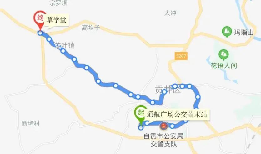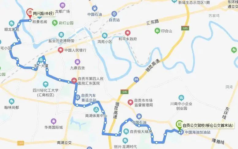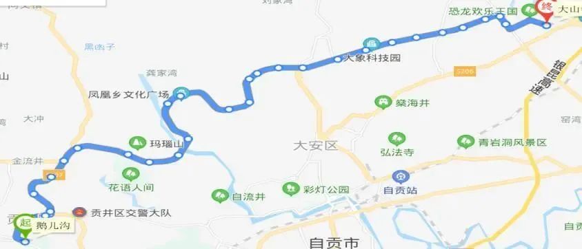 上行:鹅儿沟—贡井—贡井长征医院—马槽塘—气古坳—雷公滩—雷公滩大桥—白家湾—双河口大桥—芦蒿冲—观音滩—大塘山—沙鱼坝—高硐桥—高硐街—高硐—俞家湾—董家—威鹏电缆—鸿山翡翠城—盐卡子—怡景园—天娇城—川南东大家居城—大安政务中心—大山铺城乡客运站;