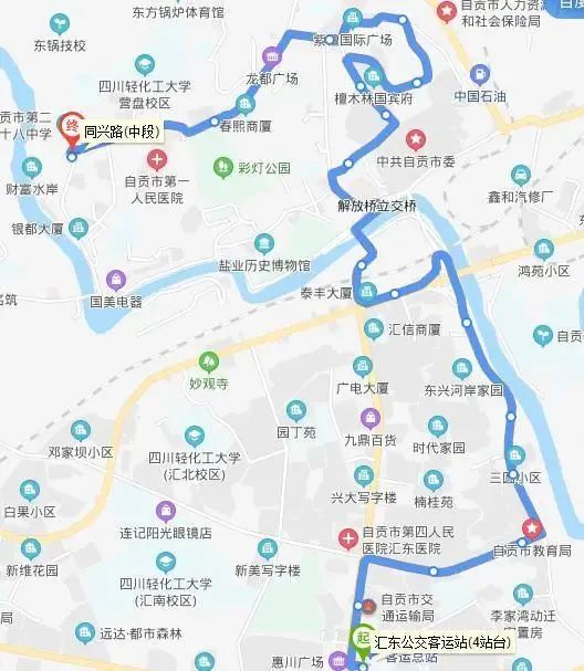 下行:同兴路中段—自贡同心医院—东方广场—灯杆坝—塘坎上—市委(西门)—市规划研究院—钟云山—钟云山招呼站—檀木林体育场—市住建局—簸米湾—泰丰大厦—东兴寺—钓鱼台—川西南矿区—毛家坝—方冲小区—客运总站—交通苑—南湖国际社区—公交大厦—汇东公交客运站。