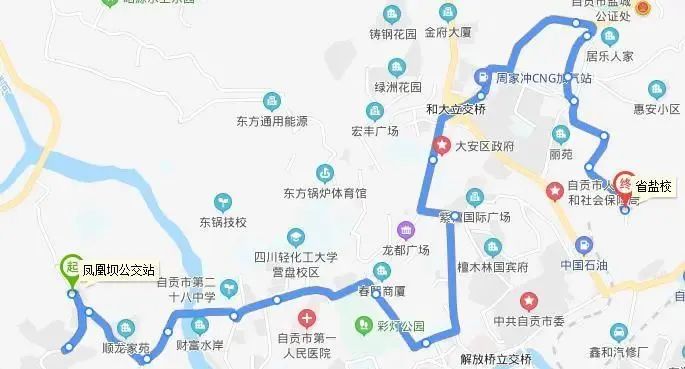 上行:凤凰坝公交站—凤鸣苑小区—郭家坳—盐仓—自井区税务局—同兴路中段—自贡同心医院—东方广场—灯杆坝—檀木林体育场—广华—周家冲—大安新街—洞口井—盐厂医院—省盐校(部分班次电器厂区间车:按原线行至周家冲—二十九中—大安新街—燊海井—烈士陵园—凉水井—硅化木—纺织厂二号门—电化厂宿舍—电器厂大门);