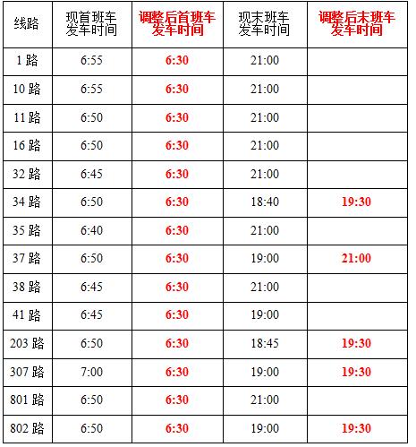 从3月18日起,以下线路首班时间提前至6:30,采取首末站双向发车方式,收班时间延迟至19:30-21:00之间。