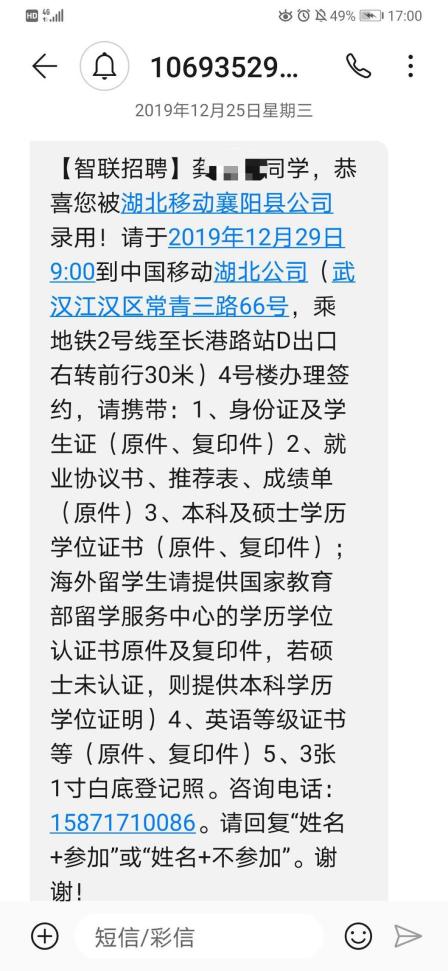 如今看来,我当时的坚持的对的。皇天不负有心人,我的努力也有了收获,接连通过了中国移动的笔试和面试,去年12月29日,中国移动给我发了offer,这让我吃下一颗“定心丸”。现在回想起来,我感到庆幸无比,选择年前看机会的人,至少比年后才开始考虑的人多一次机会。如果我过完年再找工作,肯定又是另一幅光景了。