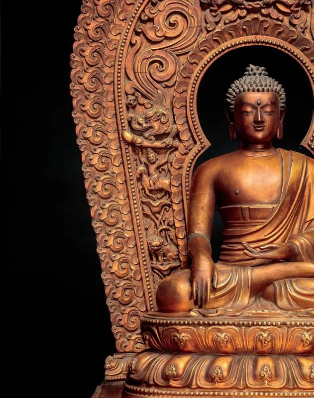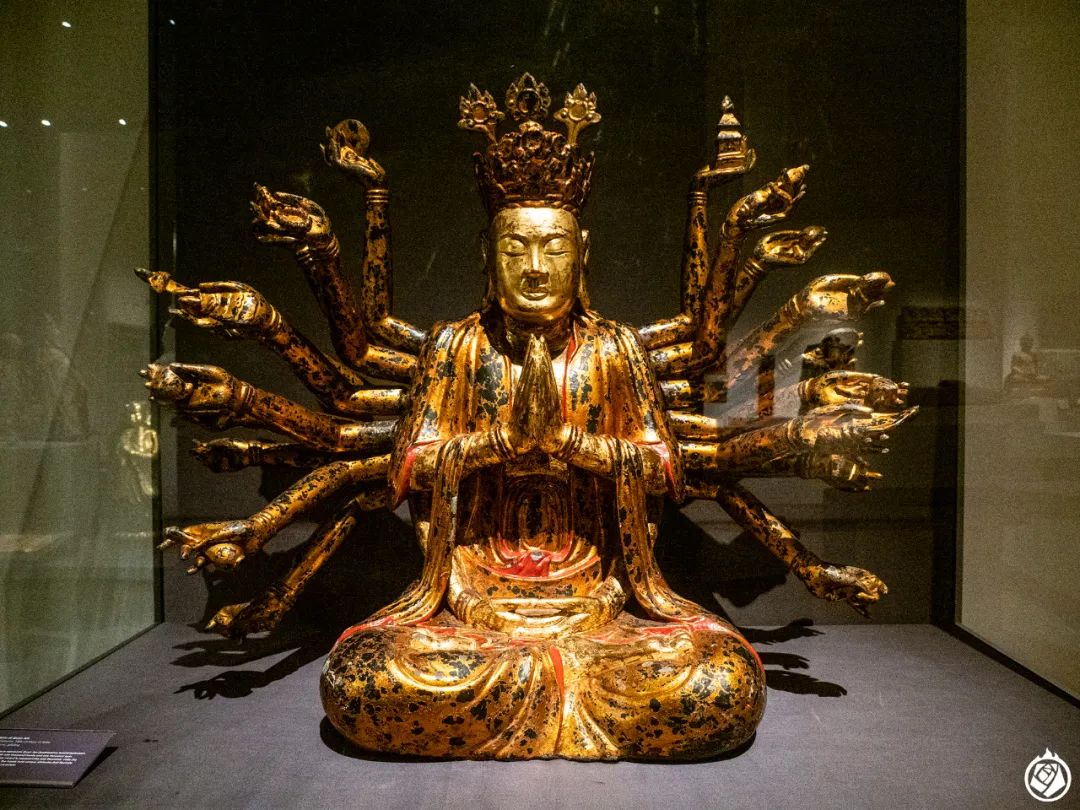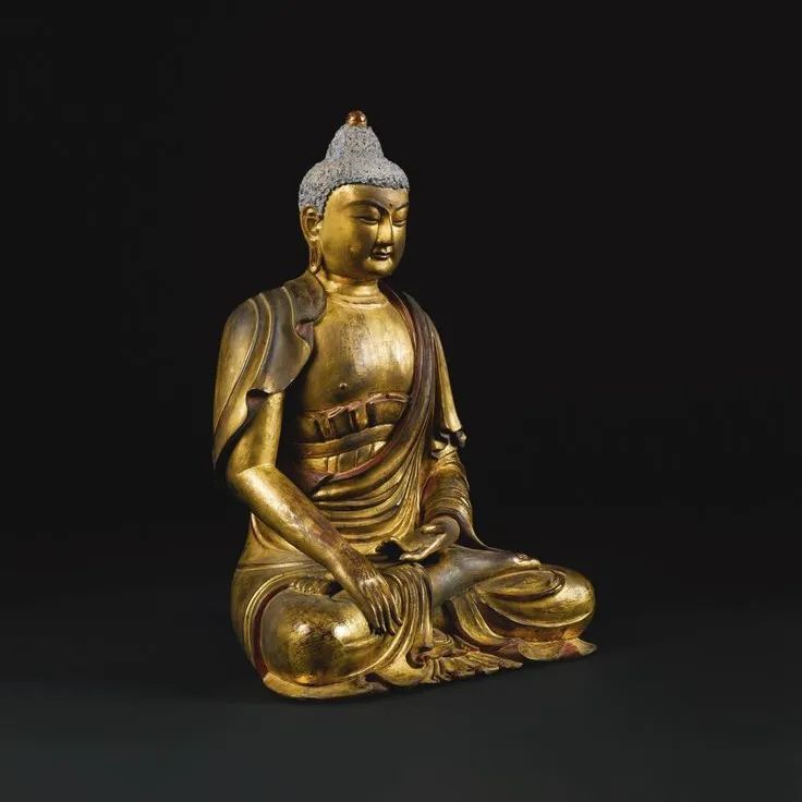 古代的佛像也上也上金漆,但高段位的古法那是一点都不俗。怎么上的金呢?引一段@旃檀佛艺 老师的解释:(古法)以生漆做底,贴完金后再上一道生漆与桐油的混合漆。开始会很黑,慢慢化开后会呈现暗红透金的颜色,也就是佛经里形容佛身的紫磨真金色。