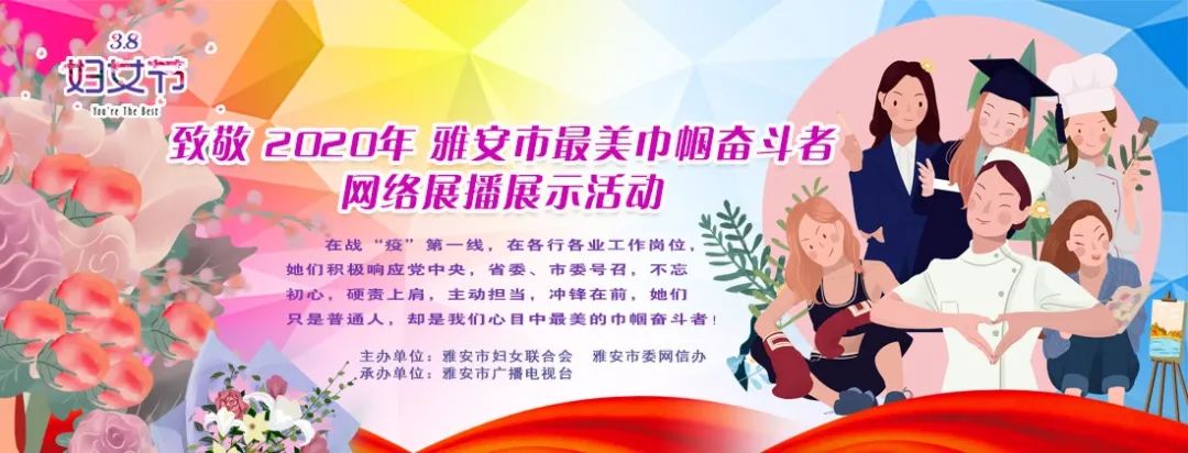 巾帼心向党,奋进新时代。今年是第110个三八国际劳动妇女节,在我们的身边还有许多最美巾帼奋斗者,接下来这几日我们将通过央视新闻+、“大爱雅女”微信公众号、“四川观察”手机客户端、“今日头条”手机客户端、雅安市广播电视台(公共频道、新闻频道、雨城频道)“无线雅安”手机客户端、市区楼宇广告等每日更新展播,请大家继续关注,同时,希望大家积极传播正能量,在留言区为我们的女英雄们留言吧!
