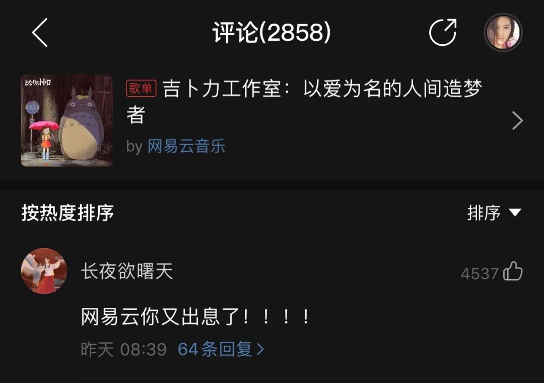 在网易云音乐的一顿操作下,最开心的还是用户。不少用户在社交媒体上表示"黑胶会员越来越香了",在吉卜力的官方歌单下,"网易云你又出息了!!!"获得最高赞,大概也是此前部分歌曲变灰后的用户心声。