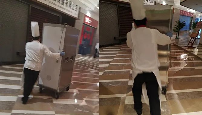 事项:工作人员将备餐间的保温柜推至发餐点发放。