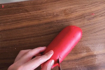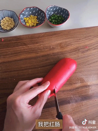 1⃣️把红肠雕成鱼的形状,将鱼背一层层片起,直至它的背上没有缝隙